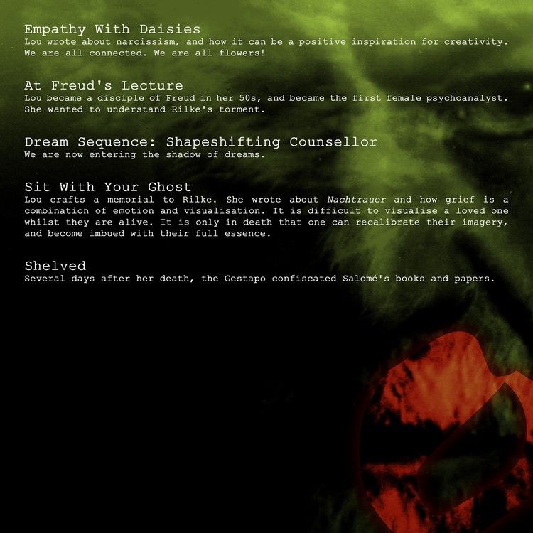 In 2022, Stefano Santachiara, the Italian author of a biographical play about Salomé's life invited us to create a new work on the theme, and this album is the result; a new biographical work which explores the life of Salomé, and her relationships. Each track explores a different aspect of her personality and relationships. Entwined in Infinity, for example, explores the minds of Salomé and Nietzsche. The Bird in Borrowed Feathers looks at Friedrich Carl Andreas, and Cosmic Solitude, Give Me Your Pain, and Sit With Your Ghost explores her deep relationship with the poet Rilke. The album is rounded off with a new musical version of Richard Dadd's poem The Fairy Feller's Master-Stroke, and a new translation of the Rilke poem, The Flower of Farewell. The music for the live premiere performance was based on solo piano. Here the music is enhanced with orchestral instruments, guitars, synthesizers, music box, and even the rhythmic mock-quill of Neitzsche! |